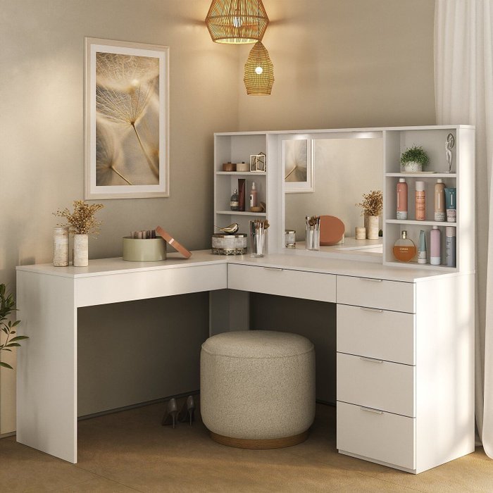 Penteadeira Escrivaninha em L com Espelho Led 5 Gavetas 6 Nichos Branco