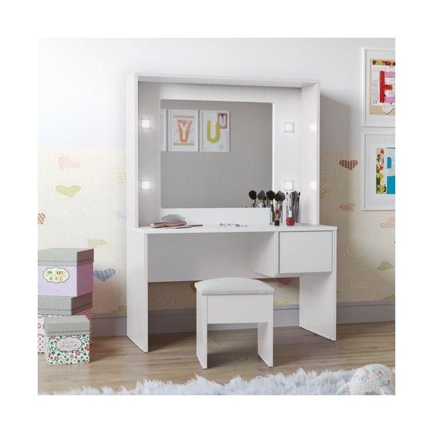Diferenciais do produto:Assento almofadado em corino brancoPenteadeira com 4 LEDSapata PlasticaMDF/MDP 15 mm"Dimensões do produto montado:Altura 107cmLargura 78cmProfundidade 34cmAltura Bancada 47cmEspaço interno para banqueta 51,5cmEspelho Altura 42,5Largura 46,5Dimensões da Banqueta:Altura 28cmLargura 26cmProfundidade 23cm