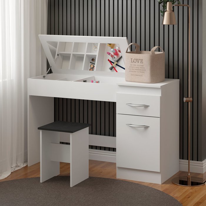 A Mesa Escrivaninha Penteadeira Slim é perfeita para o dia a dia. Possui uma gaveta, uma porta e tampo com divisões internas, ótimos para guardar todo o seu material e manter tudo organizado. Acompanha banco multifuncional, ideal para utilizar na hora dos estudos ou da produção. Produzidos com materiais de excelente qualidade, garantindo a durabilidade e vida útil do móvel. O melhor em móveis no design atual aliando conforto, qualidade e ótimos preços, só na Menu Móveis!