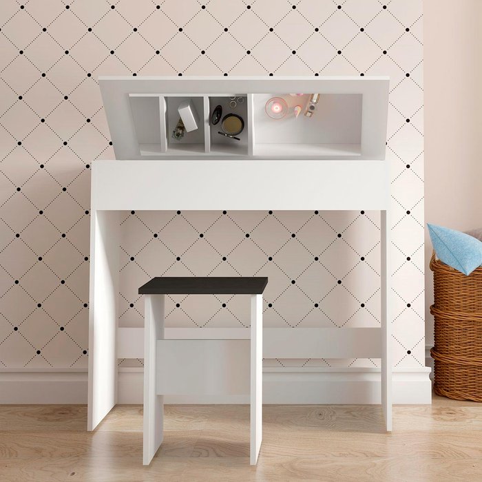 Penteadeira Pequena Mesa Escrivaninha Completa Espelho Divisões Banco MDP Branco 0741 - PRIME