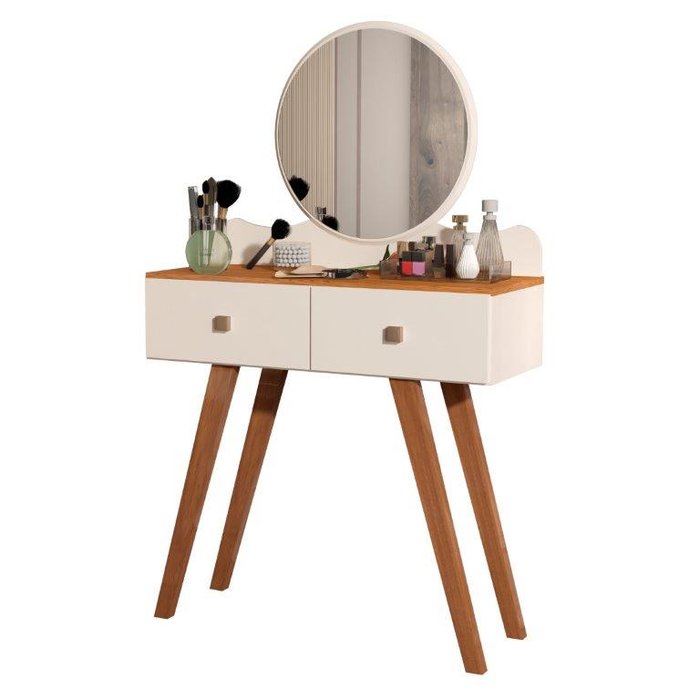 Penteadeira Retrô 2 Gavetas Conde com Espelho Redondo Cor Off White com Nature Ultimas Unidades