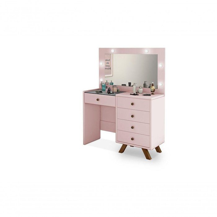 Penteadeira Rosa Com 5 Gavetas + Led Bivolt + Espelho Luxo