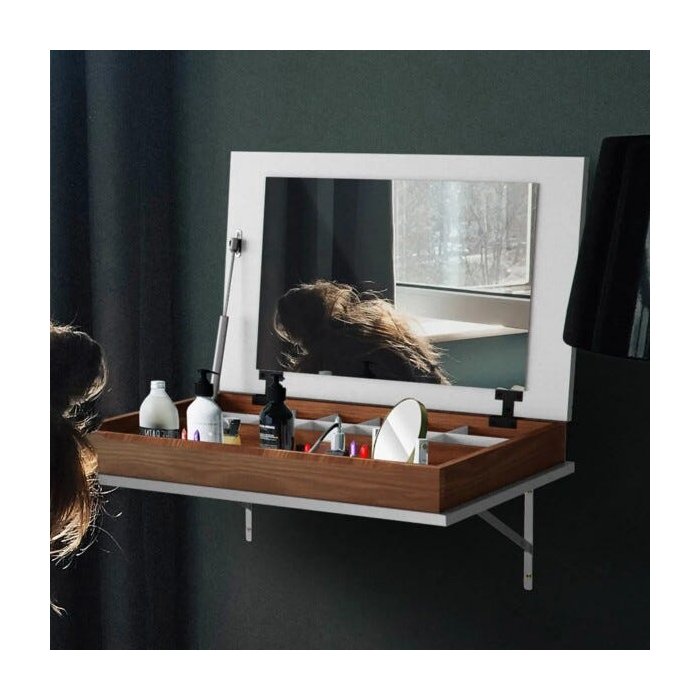 Nossa penteadeira camarim pequena Belier é como se fosse um camarim suspenso que ainda se torna escrivaninha penteadeira. Permitindo a você ter ainda mais espaço em seu comôdo.
