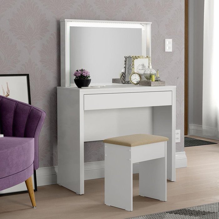 Delicada, clean e iluminada.Penteadeira Patrimar Yasmin 4 Gavetas com Banco Branco, penteadeira com traços retos e clean te dão uma maior amplitude de oportunidades de decoração.Especificações:Iluminação de Led