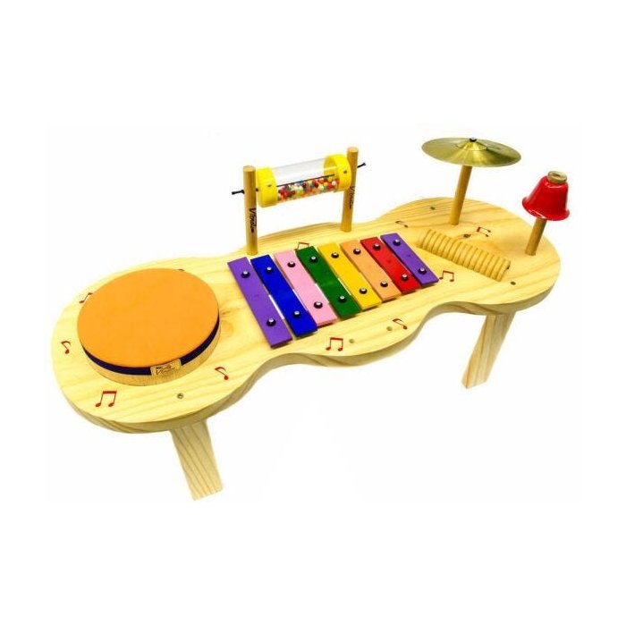 Uma mesa infantil de percussão, com vários instrumentos para a criança aprender brincando, as primeiras noções musicais. Ideal para escolas, creches e brinquedotecas.