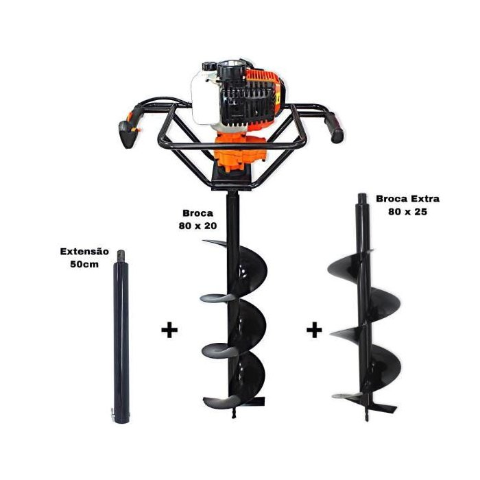 Apresentação: Em uma Caixa 40x60x34cm contendo 01 Motor do Perfurador, 01 Dosador de Combustível, 01 Chave de Vela, 02 Chaves Allen, 01 Chave de Boca e Manual do produto. Em uma caixa 20x21x80cm contendo 01 Broca 80 x20cm com Pino Trava e Grampo + Brince Broca 80x25 + Extensão
