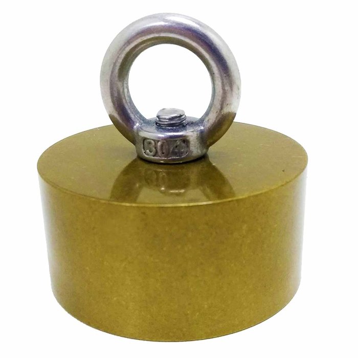 Ímã de Neodímio Premium para Pesca Magnética 64x31mm com Proteção em Aço Inox Dourado e Gancho Olhal