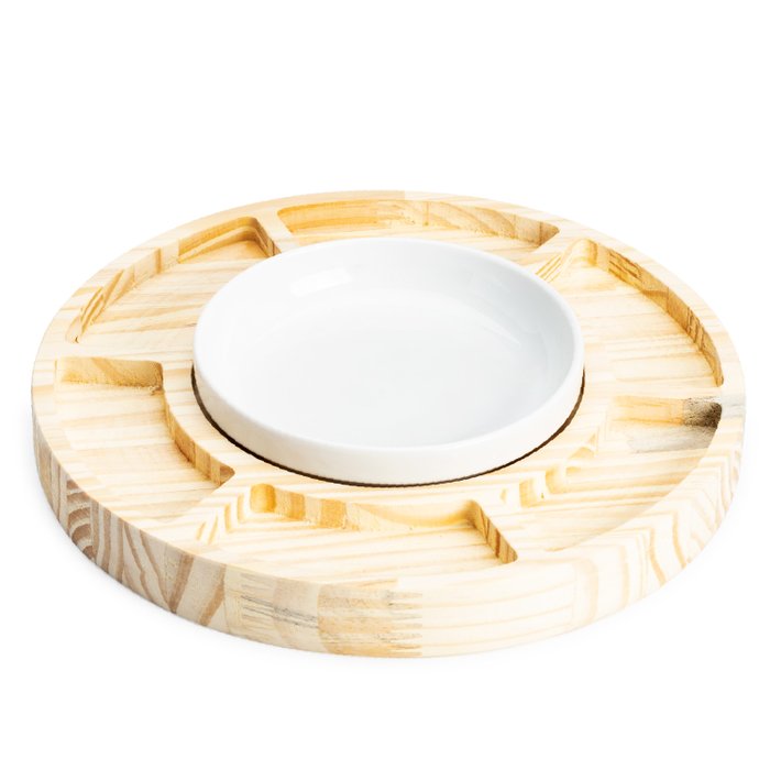Petisqueira redonda, produzida artesanalmente em madeira pinus de alta qualidade, acompanhada de travessa redonda de porcelana branca no centro.