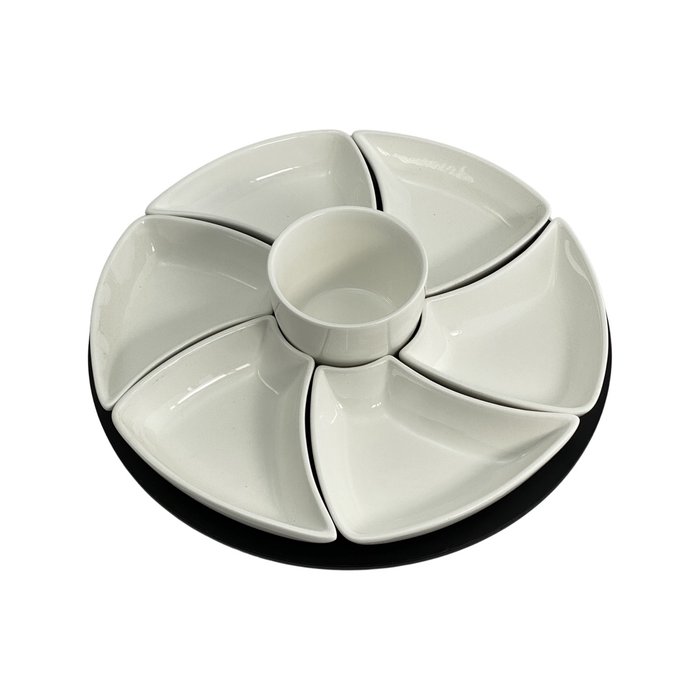 PETISQUEIRA PORCELANA 30,5CM - Dimensões da Peça: - Montado: 30,5 x 30,5 x 7 - Petisqueiras: 14 x 10 x 2,5cm - Pote: 8,5 x 8,5 x 6,5cm - Bandeja: 30,5 x 30,5 x 2cm - Dimensões da Embalagem: 30,5 x 9 x 30,5cm - Quantidade Master: 6 Peças - Dimensões Master: 59 x 32 x 33cm - Material: Porcelana - Cor: - Petisqueiras e pote: Branco - Bandeja: Preta - Tipo de Embalagem: Caixa litografada - Marca: Haüskraft - Origem: Índia - Capacidade: - Petisqueiras: 150ml - Pote: 230ml - Espessura: 4mm - Contém 8 peças: - 6 petisqueiras, - 1 bandeja, - 1 pote, - Cuidados: - Lave com detergente neutro e enxágue com água em abundância. - Para secar, utilize um pano seco e macio. - Evite o uso de produtos abrasivos. - Lave antes de usar pela primeira vez. - Não recomendável o uso em máquina de lavar louça.