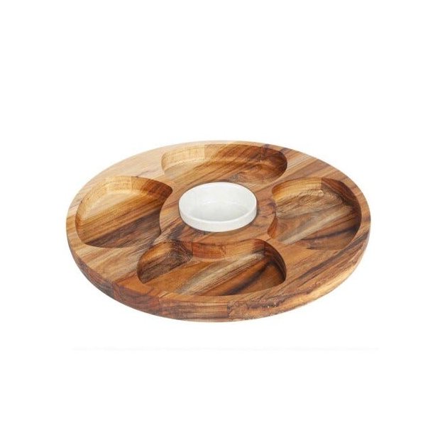 Petisqueira redonda em madeira com pote, contém 4 repartições e um pote de porcelana para servir frios, molhos, acompanhamentos e outros. Produzido em madeira teca e porcelana.