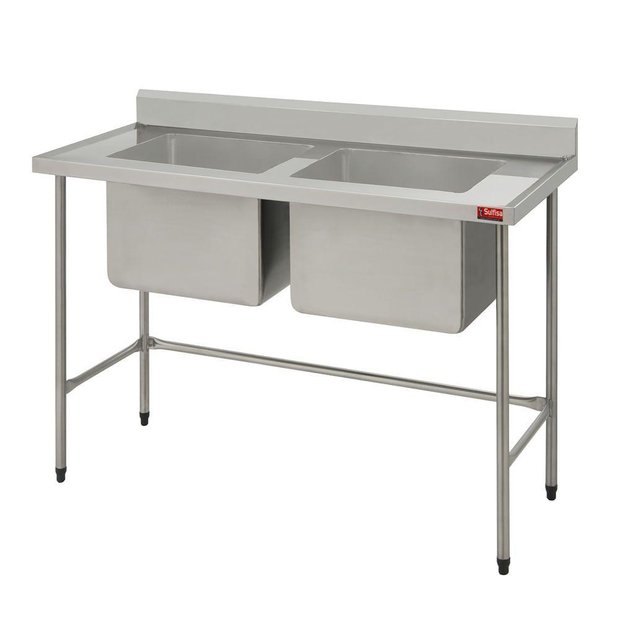 Pia com 2 Cubas Inox Sulfisa. Tampo apoiado sobre estrutura com espelho de encosto e borda d'água. Construída inteiramente em aço inox 304. Pés com sapatas niveladoras e contraventamento em aço inox. DIMENSÕES DA CUBA(CxAxL): 50x40x25cm. DIMENSÕES(CxAxL): 190x90x70cm. Pia com 2 Cubas Inox Sulfisa é na Atau.