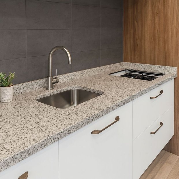 A Pia de Granito Arabesco combina elegância, funcionalidade e durabilidade em um único produto. Ideal para cozinhas modernas, une o charme natural do granito à praticidade da cuba em inox e o espaço extra da parte seca, além do corte para cooktop de 4 bocas.