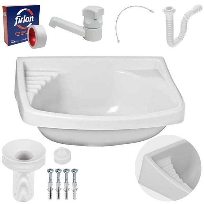 Pia Lavatório Banheiro 4,8L + Torneira Branca + Sifão Universal Branco + Engate + Veda Rosca Branca