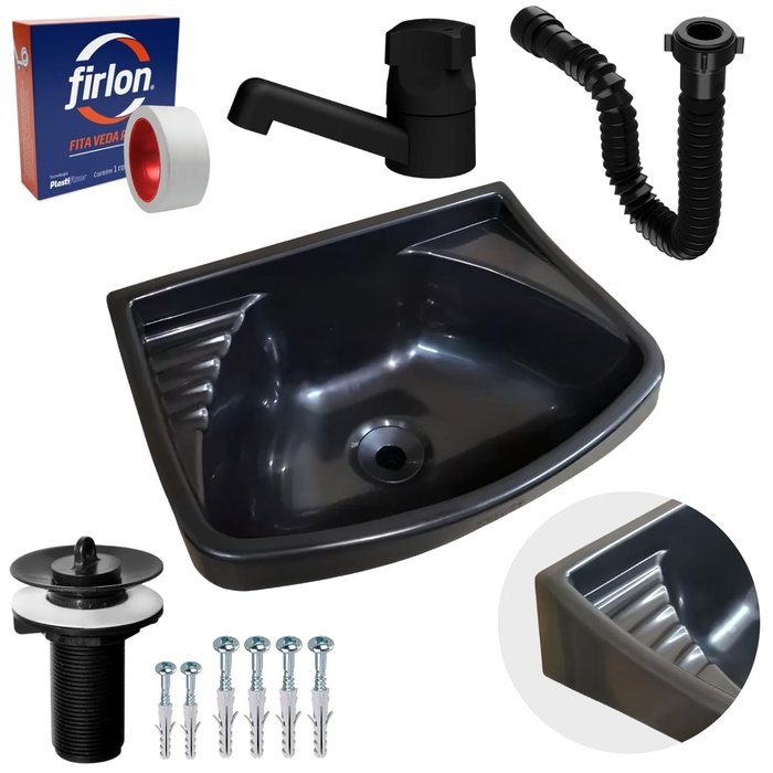 Pia Lavatório Plástico 4,8l Preta + Sifão Sanfonado Universal 61cm Preto + Torneira Preta + Veda Ros