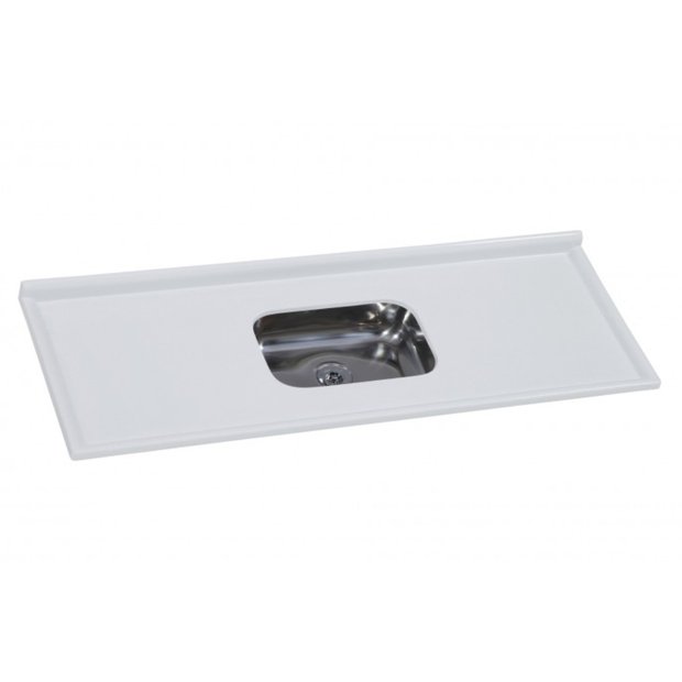 Produto em mármore sintético com espessuras reforçadas, com cobertura granitada de gel coat com brilho e resistência incomparáveis e cuba de aço Inox.