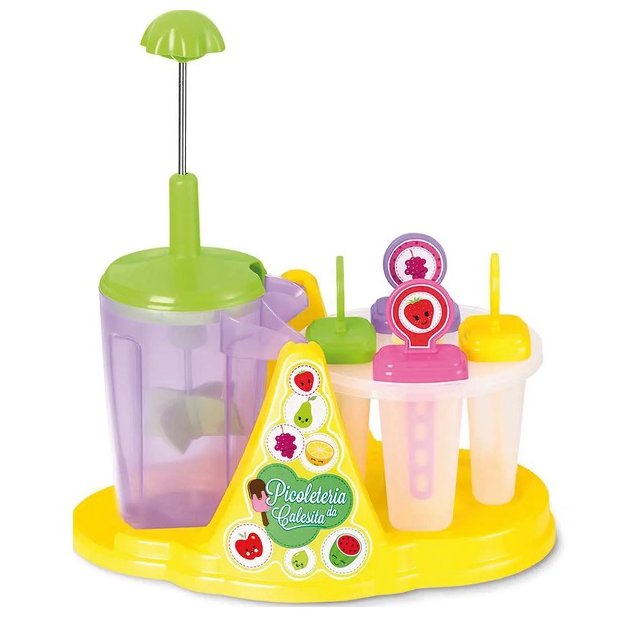 A Picoleteria Calesita vem com 4 palitinhos coloridos laváveis, forma e copo misturador.