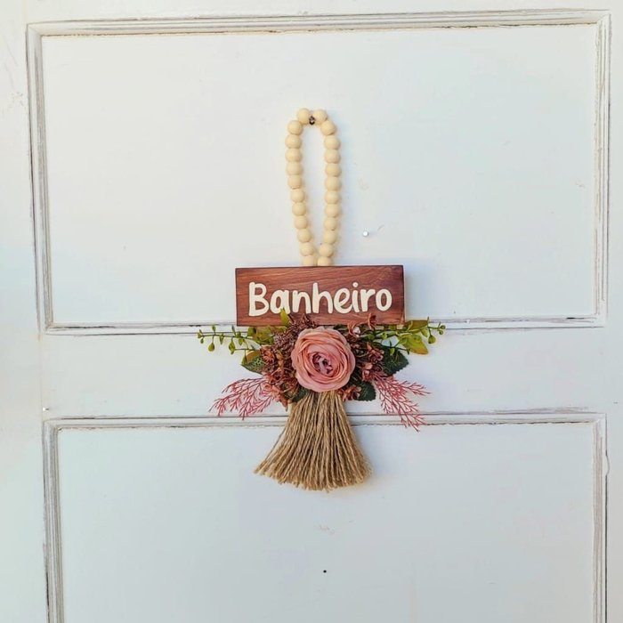 Imagine um pingente artesanal encantador, feito com bolinhas de madeira naturais dispostas em um fio resistente, formando um belo colar decorativo. No final do fio, pequenas cordas se soltam suavemente, criando um efeito rústico e delicado. A peça é enriquecida com flores em tom rose, que trazem um toque romântico e sofisticado à composição. Para completar, uma placa de madeira pintada à mão adiciona um charme único, com detalhes artísticos que fazem dessa peça um destaque especial na decoração. Ideal para enfeitar ambientes com um estilo boho, rústico ou romântico.
