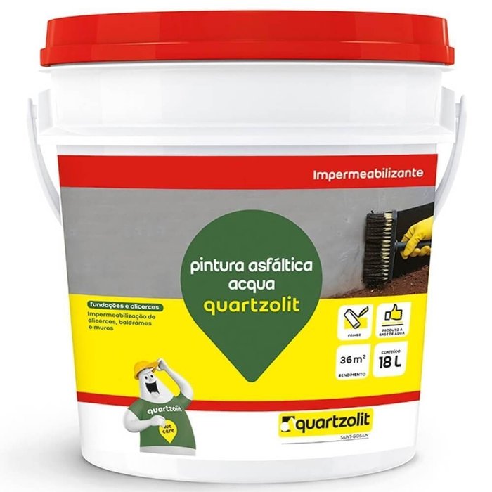 - Pintura asfáltica acqua quartzolit vem pronto para aplicação, bastando agitar a embalagem antes do uso. O produto pode ser aplicado com rolo de lã de carneiro, pincel, trincha ou sistema de projeção convencional. Para o caso do emprego do produto como adesivo de mantas asfálticas impermeabilizantes, aplique apenas uma demão do produto, cobrindo totalmente a área a impermeabilizar. Aguarde o período de 8 horas e aplique o impermeabilizante especificado. No caso da aplicação do produto como pintura de proteção contra umidade, deve-se aplicar o produto em, no mínimo, 2 demãos cruzadas e alternadas, respeitando-se o intervalo entre 8 horas entre demãos. Produtos à base de asfalto, devem, necessariamente, ser recobertos por camada mecânica protetora, para evitar a degradação do polímero asfáltico e para atendimento à NBR 9.574.