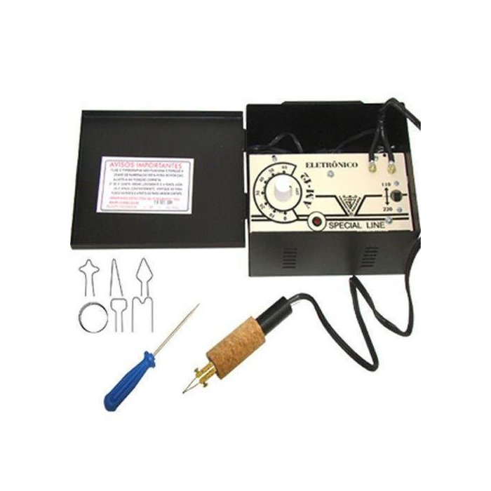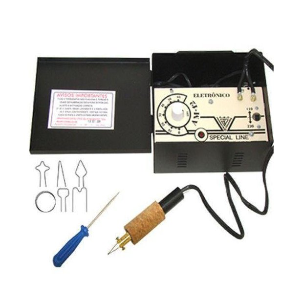 Pirógrafo Para Gravação Palante com 60 Temperaturas 110/220V (Bivolt) - AM-12 Os pirógrafos são aparelhos para gravação manual que gravam à calor em diversas superfícies: madeira, couro, cortiça, veludo, plásticos, acrílicos, garrafas PET, corte de tecidos sintéticos, EVA, entre outros. Temos diversos modelos que podem ser utilizados de acordo com a necessidade de uso, deste hobby a uso profissional. Veja as descrições dos produtos e escolha o que melhor se enquadra às suas necessidades. Dados Técnicos: -Quantidade de temperaturas: controle eletrônico de temperatura -Voltagem: 110/220V ( Bivolt) -Tempo Máximo de uso contínuo: 4:00h ( mínima), 3:00h ( média) e 2:00h (máxima) -Acessórios: Acompanha Kit de pontas FN1 ( com 5 pontas, 1 rolinho de fio Níquel Cromo e 2 parafusos) e uma chave de fenda. -caixa: Metálica Preta -Modelo da caneta que acompanha este pirógrafo: Piropen-CF -Garantia: 1 ano -Indicação: Trabalhos Amadores e Profissionais -Gravação em: madeira, couro, cortiça, EVA, plásticos , tecidos sintéticos, papel, acrílico , vidro e EPS ( utilizando as pontas especiais - vendidas separadamente). Por possuir controle eletrônico de temperatura possibilita uma maior gama de temperaturas que os modelos com as temperaturas pré-definidas, deste forma você conseguirá ter uma grande melhora e definição nos tons de sombreamento, executando trabalhos mais artísticos.
