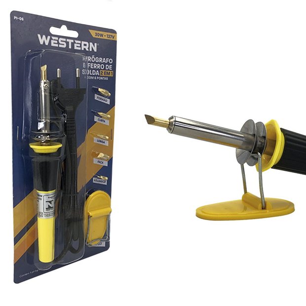 Pirógrafo e Ferro de Solda 2 em 1 A ferramenta ideal para busca um ferro de solda ou de um pirógrafo de qualidade para agregar valor aos projetos de artesanato em madeira. Possibilitando criar belas peças de arte e ainda realizar reparos e manutenções em diversos tipos de materiais, o pirógrafo possui diversas pontas de diferentes formatos, permitindo que você crie infinidades de desenhos e traços detalhados em madeira, couro e outras superfícies. Além de poder realizar reparos em fios, placas eletrônicas e outros materiais. Conta com 5 tipos de pontas para usar de diversas formas, e graças ao seu design, ele é versátil, prático e fácil de usar, permitindo utiliza-lo com mais precisão. *CUIDADOS*-Mantenha fora do alcance de crianças;-Recomenda-se o uso em ambiente seco, limpo e ventilado sem a presença de materiais corrosivos, inflamáveis ou gases explosivos;-Não toque no bico e na resistência enquanto estiver estiver ligado.