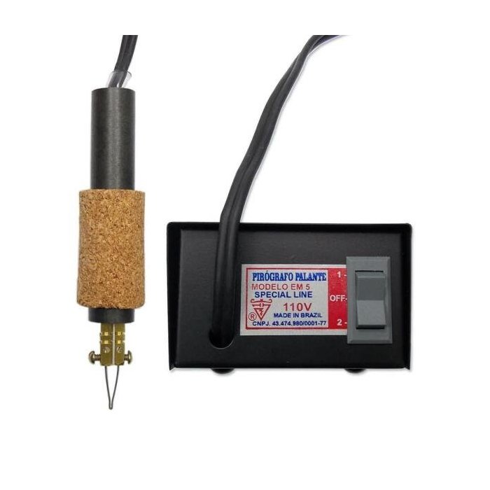 Pirógrafo para Arte Palante 110V EM-5-1 Standard Pirógrafo é uma ferramenta utilizada para gravação em madeira, couro e diversos materiais, através de uma caneta com ponta metálica em alta temperatura queima o material, permitindo assim efetuar gravações e trabalhos artísticos. - Marca: Palante - Quantidade de temperaturas: 2 - Voltagem: 110V - Tempo Máximo de uso contínuo: 3:00h ( mínima) e 1:30h (máxima) - Acessórios: Acompanha Kit de pontas FN1 ( com 5 pontas, 1 rolinho de fio Níquel Cromo e 2 parafusos). - Caixa: metálica preta - Modelo da caneta que acompanha este pirógrafo: Piropen-CF - Dimensões da caixa: 5,7 x 14 x 14,3cm (AxLxP) - Peso: 0,830g