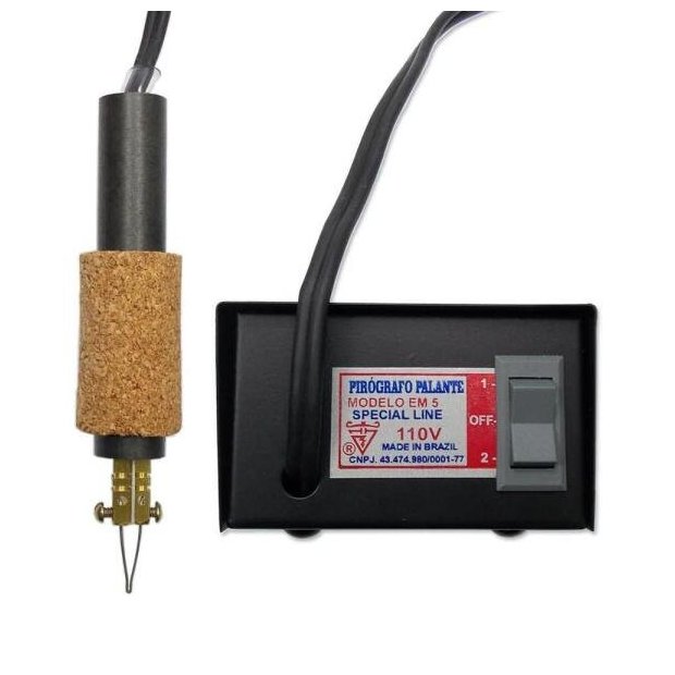 Pirógrafo para Arte Palante 110V EM-5-1 Standard Pirógrafo é uma ferramenta utilizada para gravação em madeira, couro e diversos materiais, através de uma caneta com ponta metálica em alta temperatura queima o material, permitindo assim efetuar gravações e trabalhos artísticos. - Marca: Palante - Quantidade de temperaturas: 2 - Voltagem: 110V - Tempo Máximo de uso contínuo: 3:00h ( mínima) e 1:30h (máxima) - Acessórios: Acompanha Kit de pontas FN1 ( com 5 pontas, 1 rolinho de fio Níquel Cromo e 2 parafusos). - Caixa: metálica preta - Modelo da caneta que acompanha este pirógrafo: Piropen-CF - Dimensões da caixa: 5,7 x 14 x 14,3cm (AxLxP) - Peso: 0,830g
