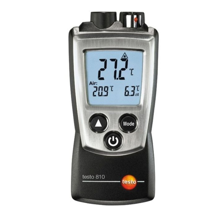 Pirômetro Infravermelho -30 a 300°C 2 Canais Faixa de Medição -10 a 50°C Testo 810. O testo 810 mede a temperatura do ar e simultaneamente a temperatura de superfície por infravermelhos sem contato. Isto permite a temperatura de superfície de um radiador, um ventilador ou uma janela ser convenientemente comparada com a temperatura do ar de um compartimento. A medição por infravermelhos é efetuada com um marcador laser de uma mira e uma ótica de 6:1. A diferença entre temperatura do ar e superfície é apresentada automaticamente. O testo 810 é muito portátil, pequeno e fácil de utilizar.