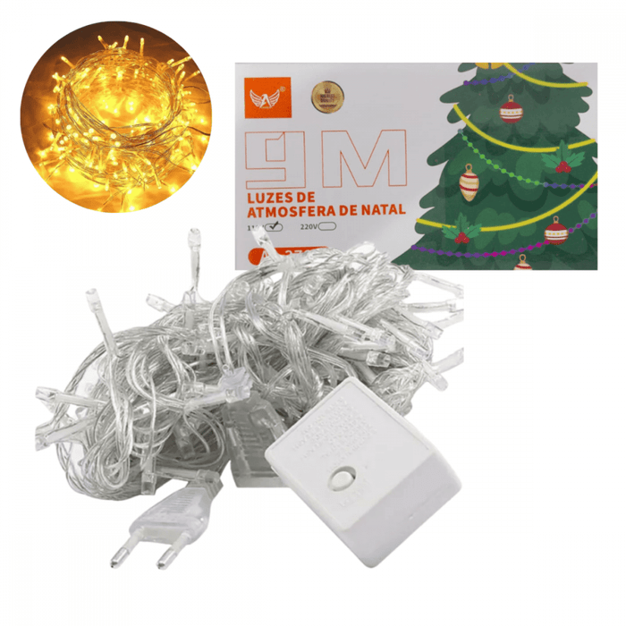Pisca Pisca Natal 110v Luzes de Led Amarelo 8 Funções 9 Metros Fio Transparente