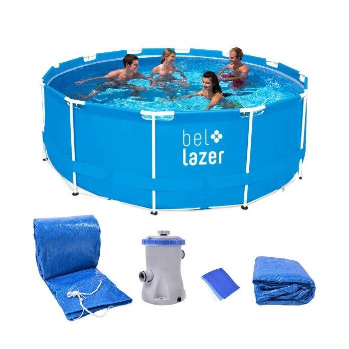 A Piscina com Armação de 10000 litros Belfix é diversão garantida para toda família! É uma piscina de montar com material altamente resistente com paredes laterais com espessura tripla de PVC e poliéster. Fácil montagem e desmontagem com armação de metal resistentes à ferrugem. Acompanha Kitcom bomba de filtragem de 2000 L/h, com capa para cobertura da piscina, e lona para forrar o chão antes de colocar a piscina garantindo maior segurança contra pequenos rasgos no fundo da piscina. Dimensões da Piscina com Armação Belfix: