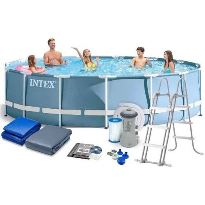 Piscina Intex Estrutural 14.614 litros - Completa Com Bomba Filtrante 110 vCom Capa, Forro e Escada Código #28733 Novo modelo. Linha Prism. Mais resistente e mais estável.Para você que procura uma piscina com maior altura e diâmetro .Medidas: 457 cm (diâmetro) x 107 cm (altura) ATENÇÃO : verifique se a área disponível é suficiente para a montagem da piscina. Você precisará de uma área de pelo menos 4,70 X 4,70 metros.Inclui Bomba Filtrante 110 vInclui Filtro para a Bomba (um cartucho refil filtro, dentro da própria bomba filtrante)Inclui Capa para ProteçãoInclui Forro para Proteção Inclui manual e DVD com Instruções Inclui Escada Inclui adesivo de reparo Resistente, prática e durável . Piscina de Vinil SUPER-TOUGH (material telado com malha de nylon, com 3 camadas) com grande capacidade de armazenamento de água.Sua estrutura é resistente para seu lazer ser seguro e confiável. Não deixe de curtir em casa com sua família e desfrutar de momentos inesquecíveis .Economia: a Bomba Filtrante e o Filtro Intex mantém a água sempre limpa. Muito fácil de armar e desarmar. Compacta e fácil de transportar.Material super resistente com a reconhecida qualidade Intex. Acompanha DVD explicativo para montagem e manutenção.Observação: A Bomba Filtrante acompanha o par de mangueiras, abraçadeiras, elemento filtrante, coadores e conexões. Vem completa e pronta para uso. Inclui um cartucho refil filtro, dentro da própria bomba filtrante. Ela é compatível com o skimmer e o kit de limpeza Deluxe da Intex (temos esses outros acessórios anunciados para venda aqui no site).A capa é original Intex, na cor cinza escuro. A capa intex contém pequenos furos no centro, os furos servem para que a capa não seja danificada nos dias de muita chuva ou de muito vento. Os furos na capa servem também para proteger a capa contra o peso da água de chuva, para que não se arrebente. A capa tem como função primordial evitar que sujeiras, folhas, detritos, etc caiam dentro da piscina.A marca Intex hoje é líder em piscinas no Brasil e em muitos outros países, sempre com produtos de qualidade, durabilidade. Quem conhece sabe. A Intex é referência mundial em piscinas, lonas e infláveis.Peso: 62 KgMedidas da embalagem: 123 x 47 x 46 cmCódigo de barras: 6941057405575