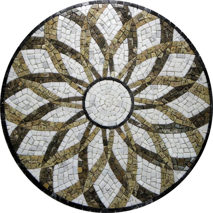 Este mosaico em estilo romano é repleto de significados simbólicos. Três campos distintos compõem essa peça única. O primeiro campo é envolvido por uma trama celta, simbolizando proteção, continuidade e ciclo. No centro, encontra-se um nó de Salomão, que representa a união do homem com o divino, atua como um filtro de proteção e representa a inter-relação universal entre todas as coisas. O campo intermediário apresenta espirais Fibonacci, que se repetem em ambas as direções, criando triângulos, semelhantes às formações florais, como a semente de girassol. Isso simboliza a lei universal que se aplica a todos e a beleza da lei divina. Além disso, devido à sua recorrência nas estruturas de sementes de plantas, também representa prosperidade, evolução e propagação, um desejo intrínseco de todos. Este mosaico é uma representação rica e profunda de significados que transcende o tempo e a cultura.