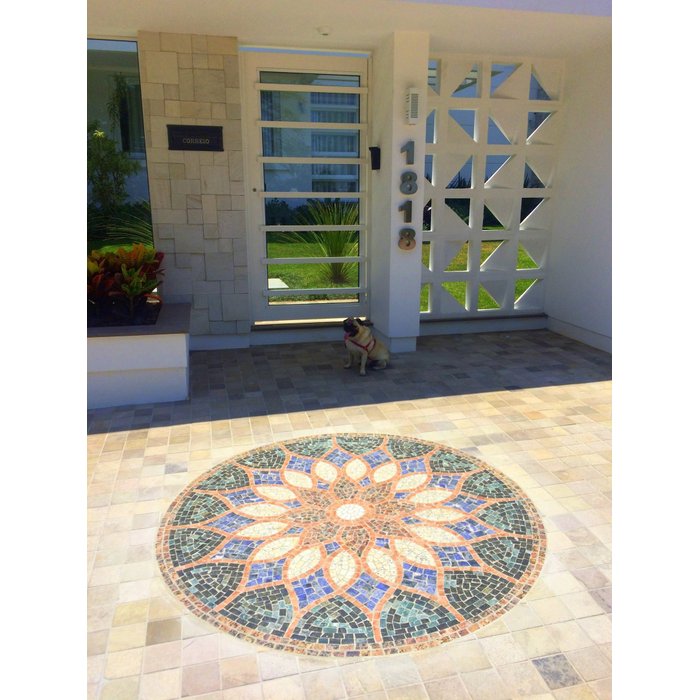 Piso mandala em mosaico feito com pedrasA Vitral Árabe é inspirada diretamente nas decorações do mundo árabe, retirado de desenhos dos palácios reais, ela traz o encanto e o charme do elaborado mundo das artes árabes. Veja mais sobre os significados desta mandala clicando em Tradução e interpretação das mandalas ao final deste texto.Pedras utilizadas: Mármore Italiano Rosso Verona, Granito Vermelho Brasília, Granito Amarelo ornamental, tons de Verde Ubatuba e verde Labrador e verde forest, Granito branco ceará e Granito Azul Bahia. Os tons podem variar conforme o lote das pedrasSignificado da mandala:Esta mandala é a repetição de um arabesco simples, que retoma a forma sinuosa e pinacular das cúpulas do mundo árabe. O arabesco constitui a combinação de linhas e de cores de formas repetidas num ritmo regular, serve de base à contemplação e permite escapar ao condicionamento temporal. Evoca a idéia do labirinto do qual se atinge o centro após um percurso complicado, cristaliza o resultado do êxito após as jornadas e provações da vida. Esta mandala também lembra o sol com seus raios emanando em todas as direções. Por isso o miolo é amarelo e os raios laranjas, passando por tonalidades neutras até o verde da natureza que recebe a energia e a materializa em alimento na terra. É mandala que traz abundância e bens, bons suprimentos de tudo o que necessitamos abundantemente.Veja mais sobre os significados desta mandala clicando em: tradução e interpretação das mandalas ao final deste texto. Aplicações: entrada, piso hall, parede. Veja sobre o manual de colocação do mosaico no link ao final deste texto. Especificações técnicas do mosaico:Feito com pedras - Mármores e granitos de todo o Brasil e importados da Europa e Ásia - para obter todas as cores desejadas em pedras naturais;Vem todo montado sobre tela, só colocar conforme manual de colocação, link no final deste texto.Resistência e Durabilidade em área interna e externa;Espessura de 10 mm – Mesma espessura do porcelanato ou piso cerâmicoLiso e agradável para uso diário;Mosaico feito integralmente à mão com técnica do mosaico romano;Veja como é produzido nosso mosaico em: Como é feito o nosso mosaico ao final deste texto.
