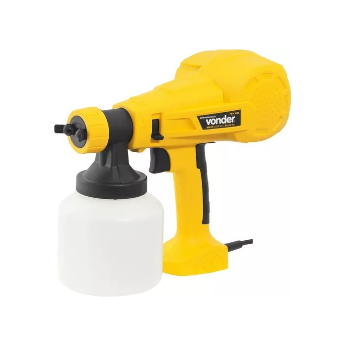 PISTOLA ELÉTRICA PARA PINTURA PEV400 VONDER-RECOMENDAÇÕES DE UTILIZAÇÃO DO PRODUTO: Antes do uso é extremamente importante fazer o teste de viscosidade da tinta com o medidor que acompanha a pistola usando o auxílio do manual de instruções.- Extremamente importante fazer uma limpeza completa da pistola, colocando água no reservatório até limpar por completo os bicos da pistola.MODO DE UTILIZAÇÃO DO MEDIDOR:- Deve-se tampar o furo inferior do medidor, encher o medidor com o líquido que será utilizado, liberar a saída do líquido pelo furo inferior e marcar o tempo;- O líquido deve escorrer totalmente em 40 segundos ou menos. Caso exceda o tempo previsto, significa que o líquido é mais espesso do que 40 DIN/S, o que acarretará no travamento e queima da pistola.MANEIRA CORRETA PARA FAZER O PROCESSO DE LIMPEZA:- 1º Passo: Se for utilizado tinta a base de solvente poderá ser utilizado aguarrás para estar auxiliando retirada de excesso de tinta, se a tinta usada for a base de água você poderá usar somente água que já ira resolver.- 2º Passo: Desmonte o bico da pistola e deixe mergulhado em aguarrás para estar soltando toda a tinta (se for uma tinta que utilizou solvente), enquanto isso pegue um pincel limpo e utilize a aguarrás ou água para estar passando na parte interna do bico porém com muito cuidado para não acabar entrando aguarrás ou água na parte interna do motor acoplado da pistola.- 3º Passo: Pegue um tecido para estar removendo o excesso de aguarrás ou água do bico da pistola para não ter acidentes, deixando cair algum líquido no motor.- 4º Passo: Limpe bem o reservatório e a mangueira de sucção desentupindo totalmente a passagem.- 5º Passo: Usando pincel e um tecido retire qualquer vestígio de tinta no acoplamento do reservatório e retire a vedação para alcançar o máximo para uma limpeza completa.- 6º Passo: Seque qualquer vestígio de água ou aguarrás usado para limpeza, e remonte a pistola novamente para utilizar ou guardar.INFORMAÇÕES TÉCNICAS:- Marca: Vonder;- Material: Plástico;- Tensão: 110V;- Potência (W): 400W;- Frequência: 50/60Hz;- Modelo: Pistola PEV 400;- Vazão de tinta: 700ml/min.DIMENSÕES:- Peso aproximado: 1,4Kg;- Altura aproximada: 26cm;- Diâmetro do bico: 2,6mm;- Largura aproximada: 28cm;- Comprimento do cabo: 2 Metros;- Profundidade aproximada: 13cm;- Capacidade do reservatório: 800ml.SOBRE O PRODUTO:- Jato com 3 opções de ajustes;- Dispensa o uso de compressores;- Possui corpo e caneca em plástico;- Recomenda-se pintar em 45º graus;- Pistola de fácil limpeza e higienização;- Aceita líquidos com viscosidade inferior a 40 DIN/S;- Normalmente a tinta será diluída com 30% de solvente;- Não esquenta muito enquanto está em funcionamento continuo;- Recomenda-se ficar entre 15cm e 5cm da superfície que irá ser pintada.- Chave de ajuste do volume de tinta e sistema HVLP (alto volume e baixa pressão);- Pistola proporciona chegar em locais de difícil acesso para pinceis ou rolos de pintura;- Motor acoplado, sendo compacta perfeita para trabalhos rápidos com agilidade.- Possui equipamentos complementares (reguladores, mangueiras e entre outros acessórios).- Gatilho com estágios, pressionar de forma leve ira ligar somente o motor e se for pressionado por completo ira soltar a tinta.CONTEÚDO DA EMBALAGEM:- 1 Pistola elétrica;- 1 Caneca plástica;- 1 Medidor de viscosidade.