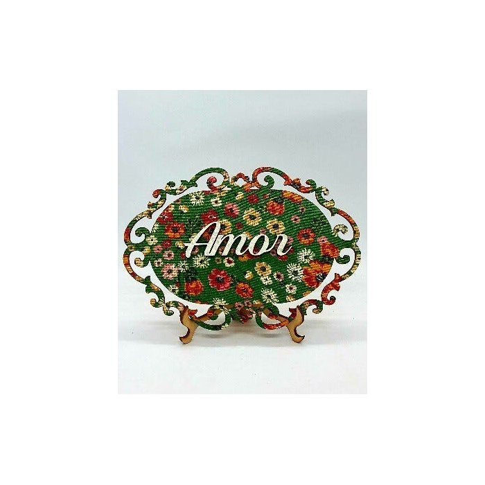 Placa arabesco decorativa de mesa ou bancada , em mdf cru 3mm decorado com chita colorida e a palavra Amor em mdf 3mm branco.