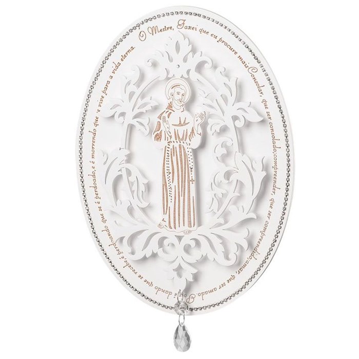Religiosa peça produzida em homenagem à São Francisco de Assis com detalhes recortados e gravados a laser. Possui pingente de cristal Swarovski e suporte nas costas.