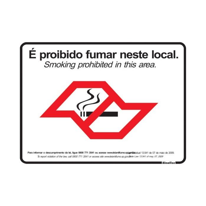 PLACA DE SINALIZAÇÃO PROIBIDO FUMAR LEI ESTADUAL SP Nº13541 20X30CM