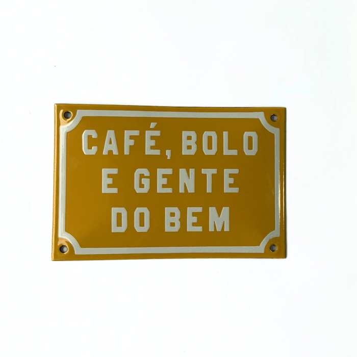 Placa decorativa esmaltada 'Café, bolo e gente do bem.'