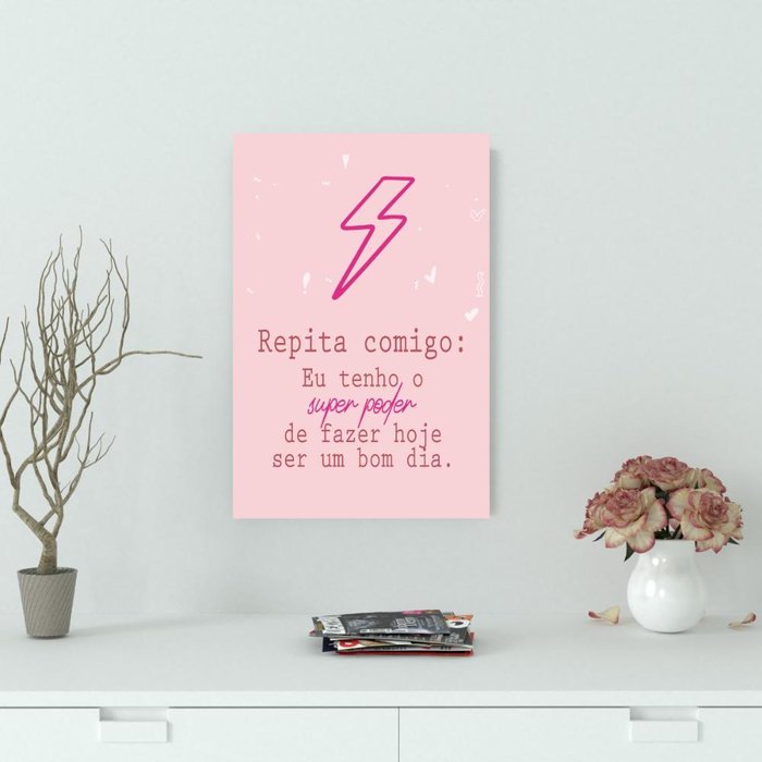 Moderno e delicado, este quadro decorativo é na cor rosa com a frase "Repita Comigo: Eu tenho o super poder de fazer hoje ser um bom dia.". Confeccionado em PVC 3mm e com impressão UV.