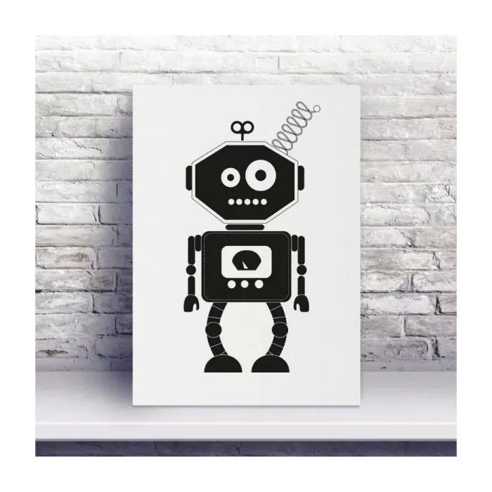 Placa decorativa, Placa MDF robô preto fundo branco.