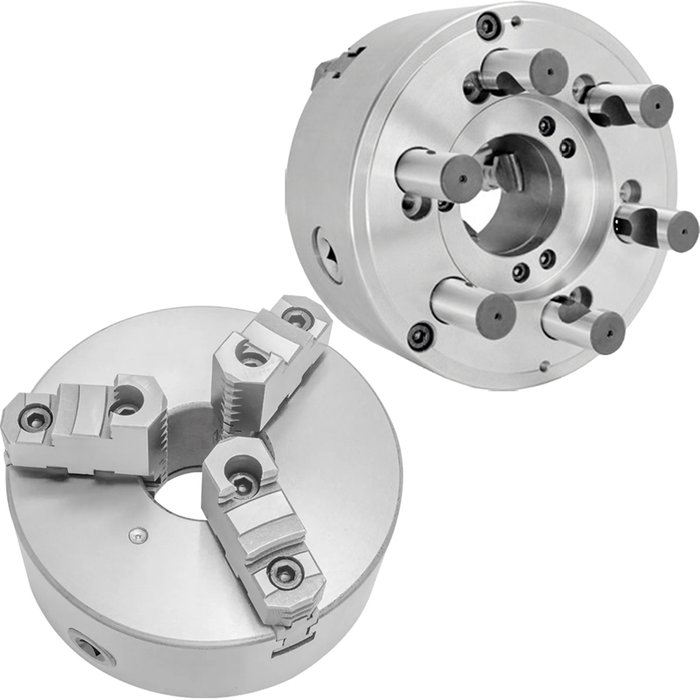 Geralmente, as placas para torno mecânico são produzidas em aço temperado ou ferro fundido, têm alta resistência e durabilidade e são compostas por castanhas reversíveis ou monobloco.