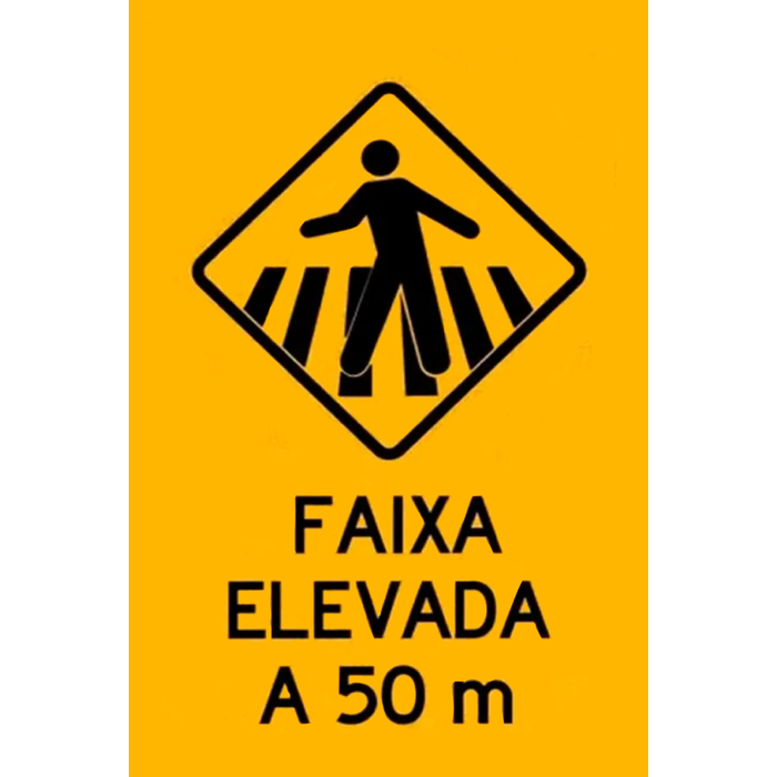 Placa de Sinalização Passagem de Pedestres Faixa Elevada a 50 Metros indica que há uma faixa elevada para pedestres a 50 metros à frente. A faixa elevada é uma medida de segurança para melhorar a visibilidade e a segurança dos pedestres ao atravessarem a rua.