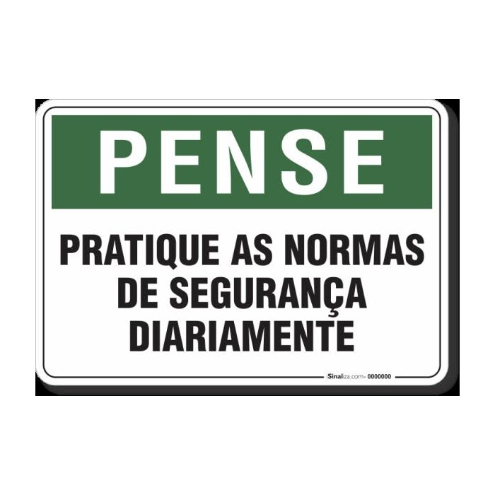 Garanta segurança e produtividade em sua empresa sinalizando corretamente com as placas de “PENSE” da iSinaliza.com. Disponíveis em diversos materiais e tamanhos, as placas estão de acordo com as Normas Regulamentadoras NR 10, NR 12, NR 19 e NR 26 do Ministério do Trabalho. Para simplificar a compreensão dos pictogramas, as placas iSinaliza.com estão todas em conformidade com o padrão de símbolos gráficos ISO. São utilizadas cores chamativas e textos que se destacam para facilitar o entendimento da placa, de acordo com as normas de segurança estabelecidas pela NBR 13434 da ABNT – Associação Brasileira de Normas Técnicas e com as Instruções de Trabalho estabelecidas pelo Corpo de Bombeiros.