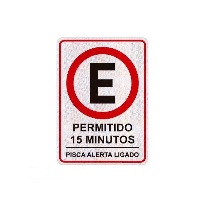 A placa "Permitido 15 Minutos - Pisca Alerta" é usada para informar que o estacionamento é permitido por um período máximo de 15 minutos e que os veículos devem estar com o pisca-alerta ligado durante esse tempo. Essa sinalização é frequentemente utilizada em áreas onde o estacionamento rápido é necessário, como em frente a estabelecimentos comerciais ou áreas de carga e descarga.