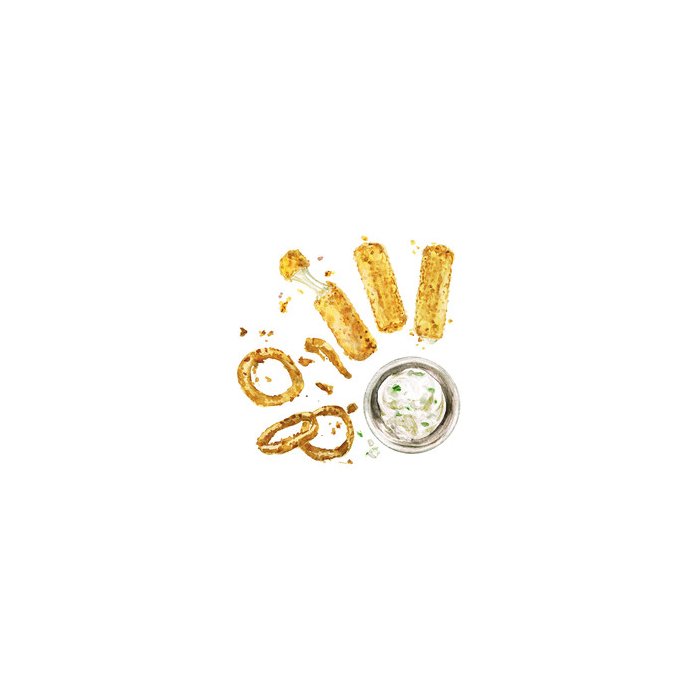 Placa quadro decorativo A3 - 30 x 42 lanches fritos. Ilustração em aquarela.