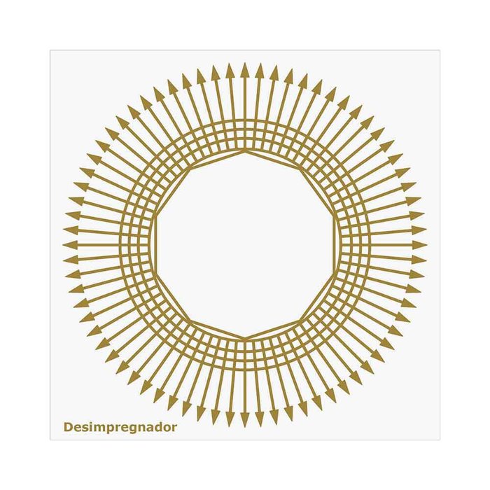 O Gráfico da Placa Radiônica Desimpregnador é composto de um decágono (potencializador), quatro círculos concêntricos (proteção/concentração) e 72 setas no sentido de força centrífuga (desimpregnadoras), possui desta forma as características do decágono, de limpeza e valorização, voltado mais ao ponto do ser humano (plano físico e material), por possuir quatro círculos.