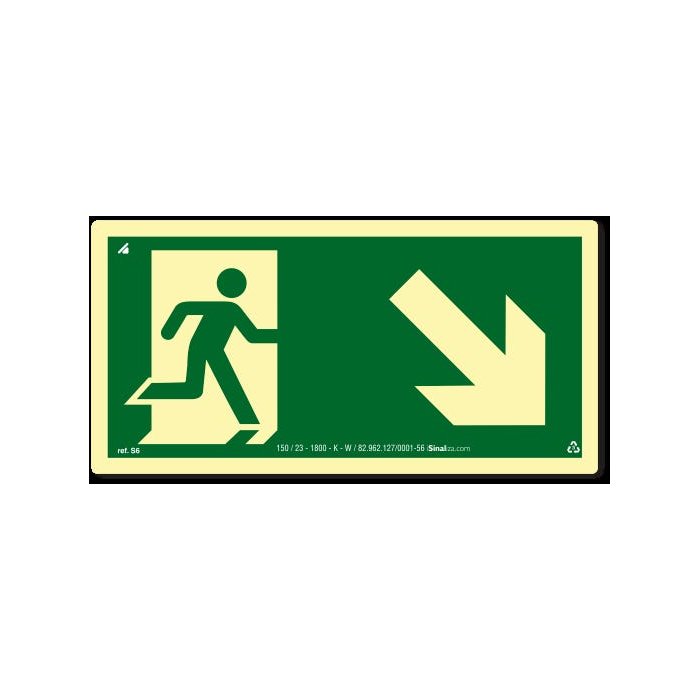 PLACA ROTA DE FUGA PICTOGRAMA E SETA DIRETA BAIXO FOTOLUMINESCENTE S6