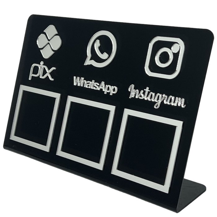 Placa Tripla Pix Instagram Whatsapp Qr Code Acrílico Preto com Prata 22x15cm