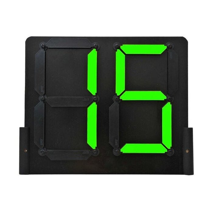 Placa sinalizadora de substituição modelo simples (um número - dois lados) fabricada pela Kief utilizando o sistema manual Digitok, onde basta girar as bandeiras e formar rapidamente o número desejado. De um lado forma números na cor verde e de outro na cor laranja. Possui manopla de madeira para segurar e erguer. Produto leve, versátil e de fácil utilização.