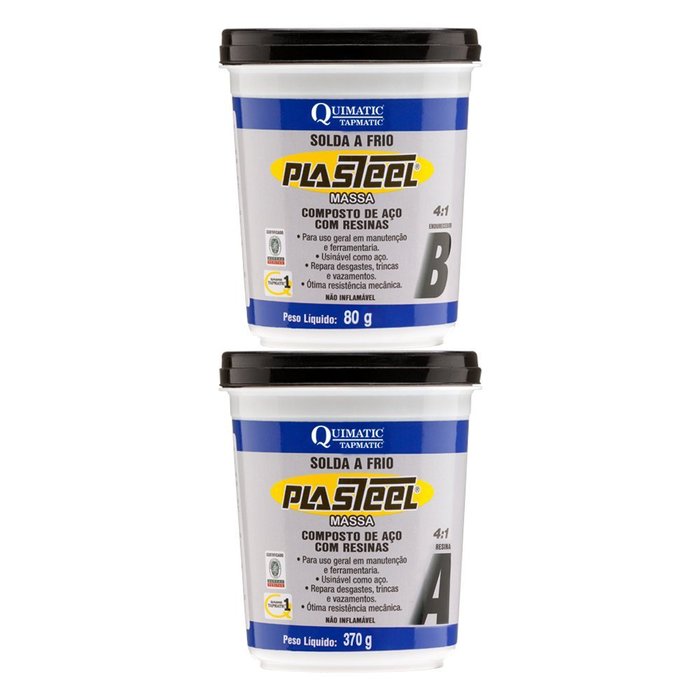 Plasteel Massa 4:1 é um composto epóxi bi-componente com carga metálica, em massa na cor preta, que pode ser aplicado com espátula. Cura a frio, substituindo de maneira eficiente a solda a quente, quando esta não pode ou não deve ser utilizada. Ideal para reparos, manutenção e ferramentaria industrial em geral. Repara desgastes, trincas, rachaduras, vazamentos, entre outros. Permite aplicações em eixos mecânicos, para preencher canais e zonas de desgaste com possibilidade de usinar a massa epóxi com excelente precisão dimensional. Preenche falhas em peças de fundição. Devido a sua coloração cinza escuro, oferece inclusive um acabamento estético compatível com a peça fundida. Recupera sedes de rolamentos. Solução viável principalmente em peças maiores que tem alto custo de reposição.