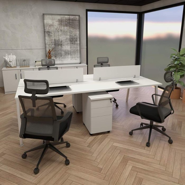 A Plataforma de Trabalho para 4 pessoas F5 Office, com pés cavalete, divisória central e 2 gaveteiros integrados, é ideal para escritórios colaborativos que buscam funcionalidade, organização e um visual moderno.